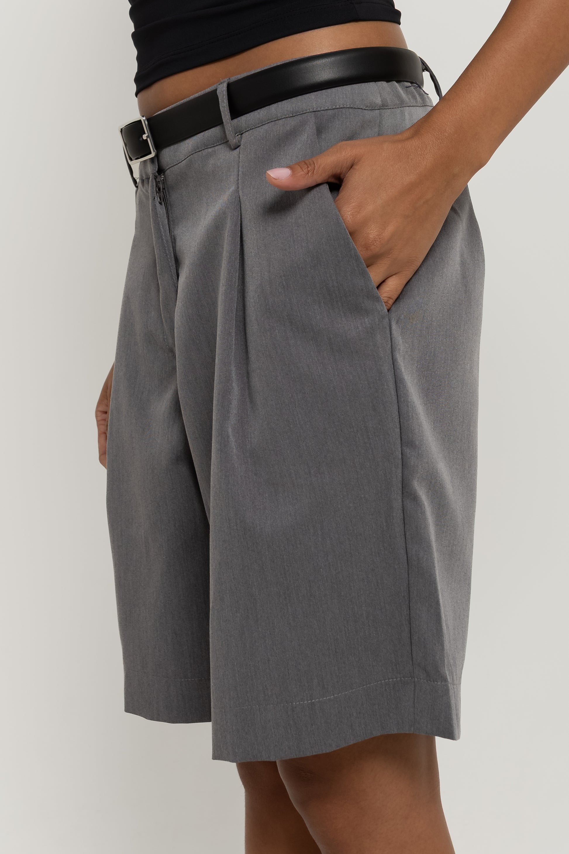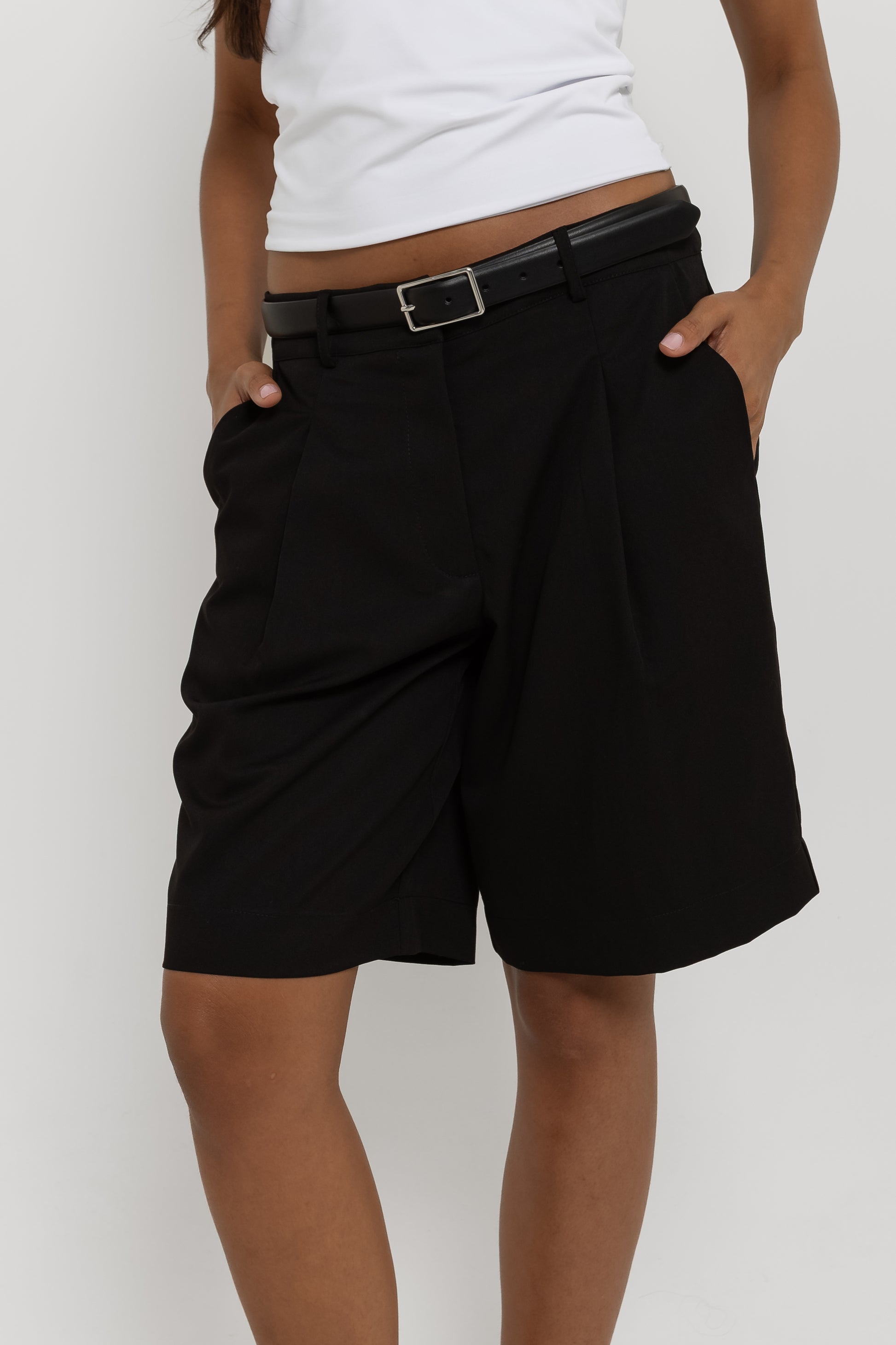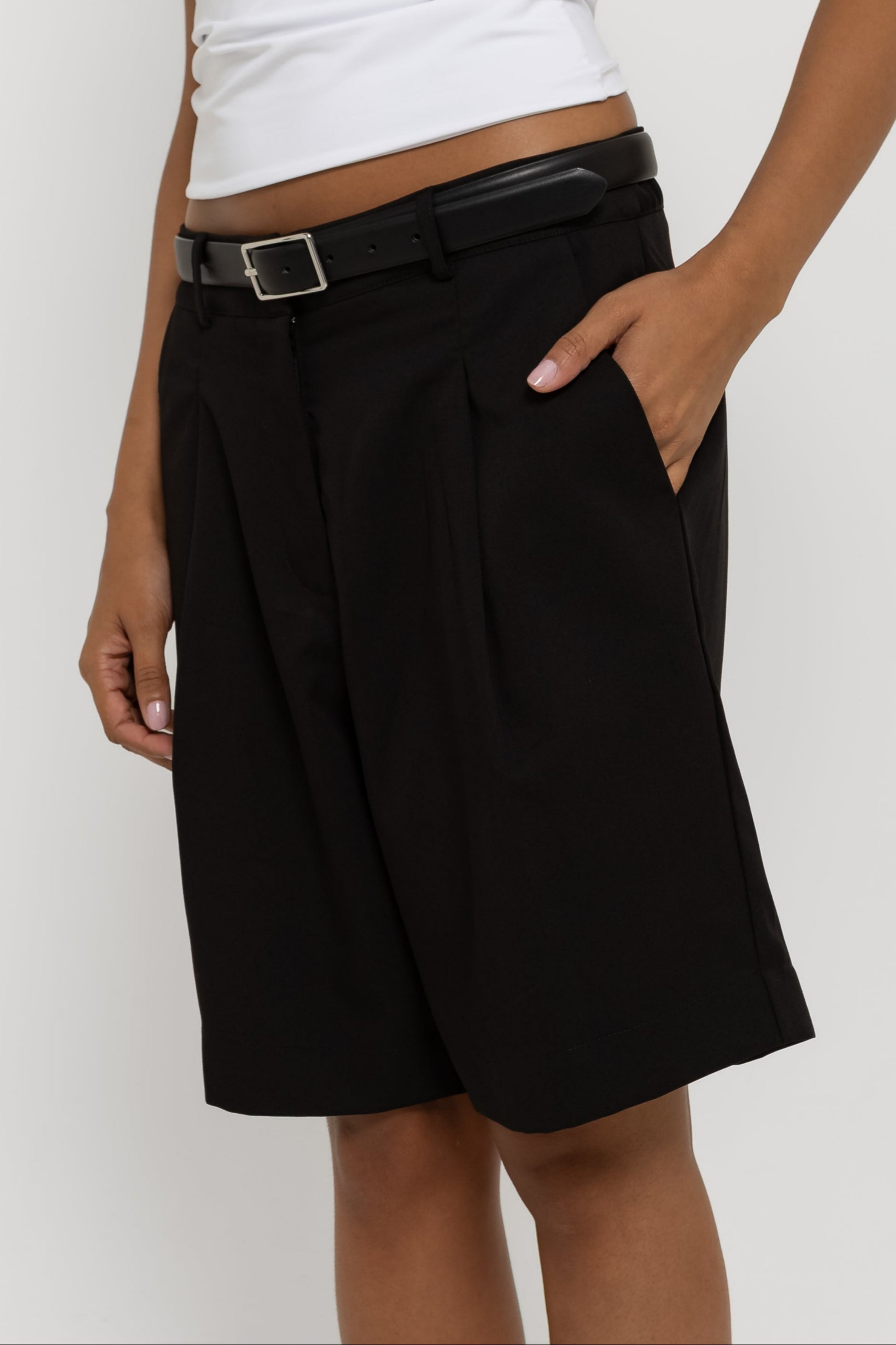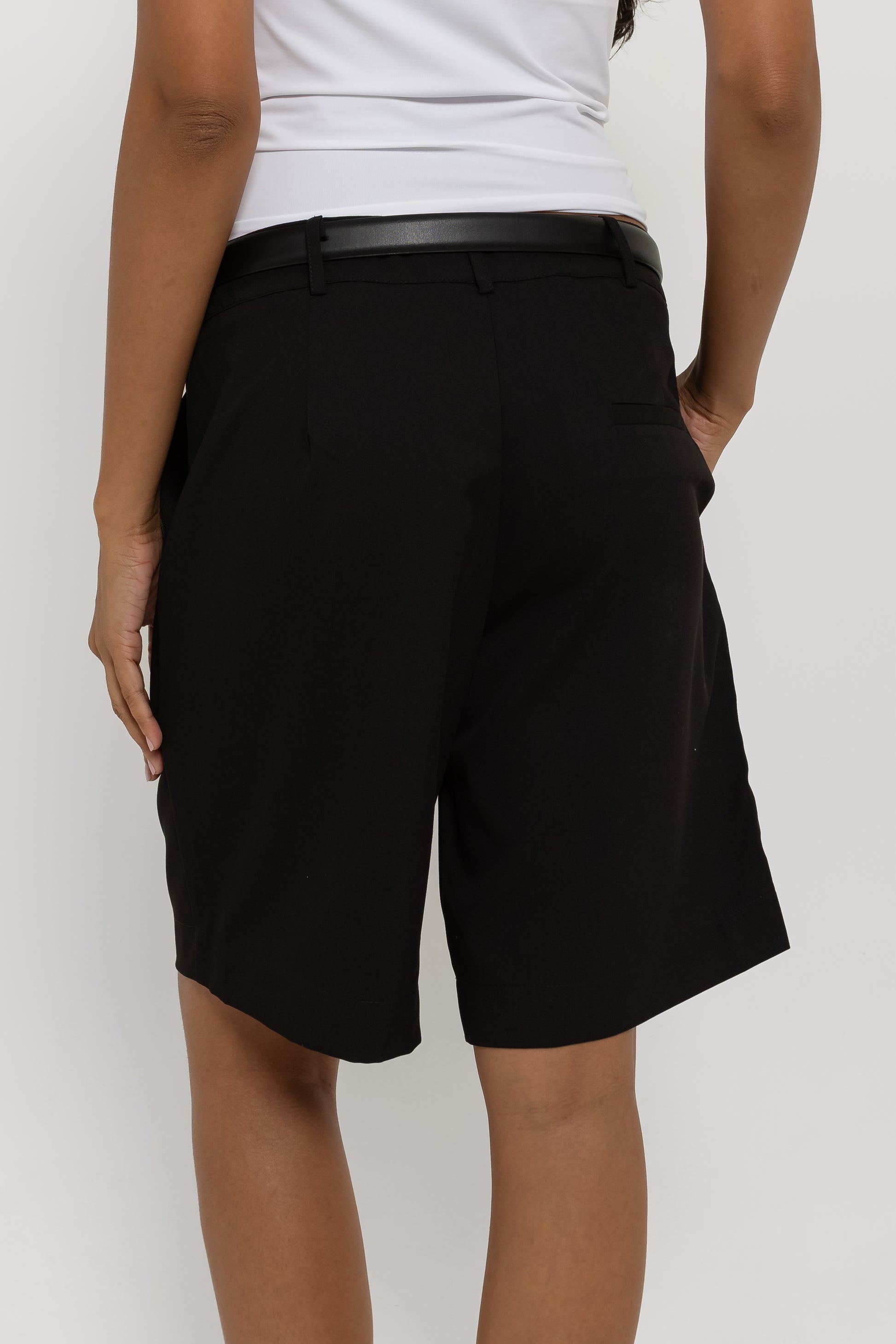 Do office ao happy hour. Confeccionada em tecido de alfaiataria mista com viscose, a Bermuda Bruna possui cintura média, com fechamento em colchete de metal, shape levemente amplo com bolsos faca laterais; um comprimento ideal, que não deixa a peça nem curta e nem comprida no corpo, além do detalhe de pregas e bolso fake único traseiro. Essa peça vai deixar suas composições muito mais interessantes!