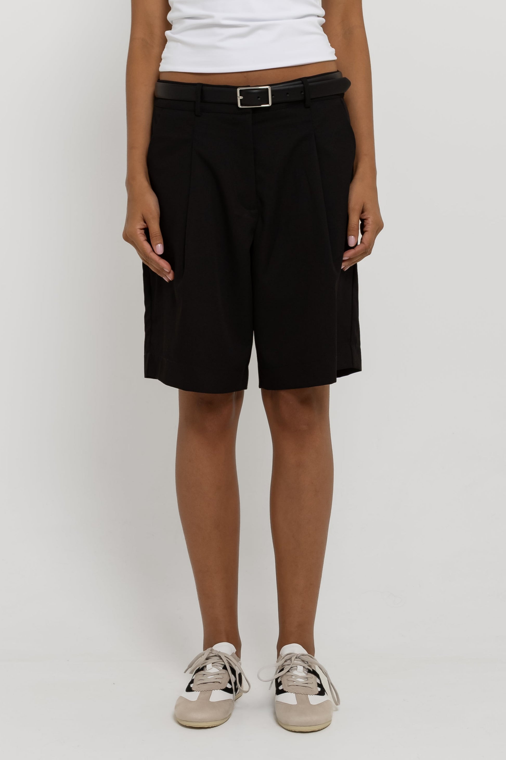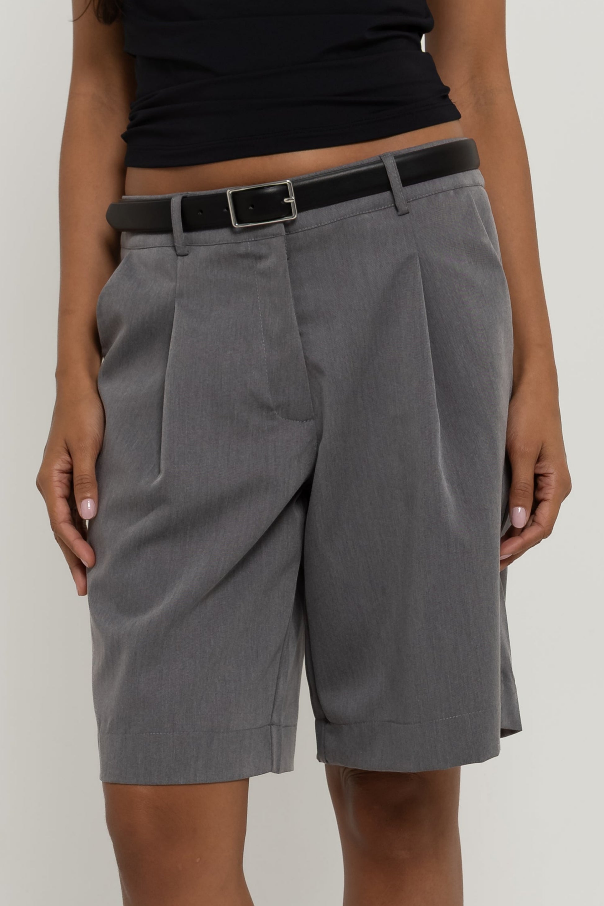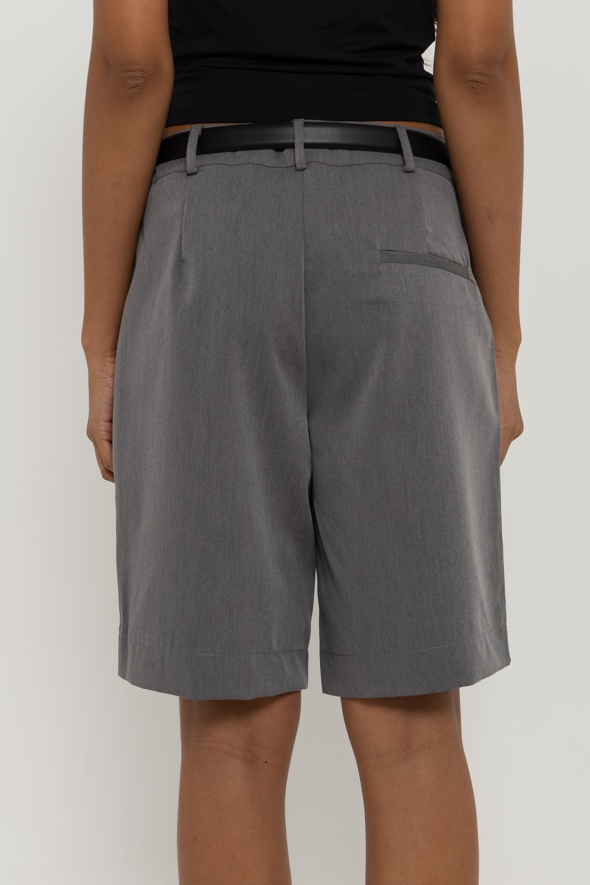 Do office ao happy hour. Confeccionada em tecido de alfaiataria mista com viscose, a Bermuda Bruna possui cintura média, com fechamento em colchete de metal, shape levemente amplo com bolsos faca laterais; um comprimento ideal, que não deixa a peça nem curta e nem comprida no corpo, além do detalhe de pregas e bolso fake único traseiro. Essa peça vai deixar suas composições muito mais interessantes!