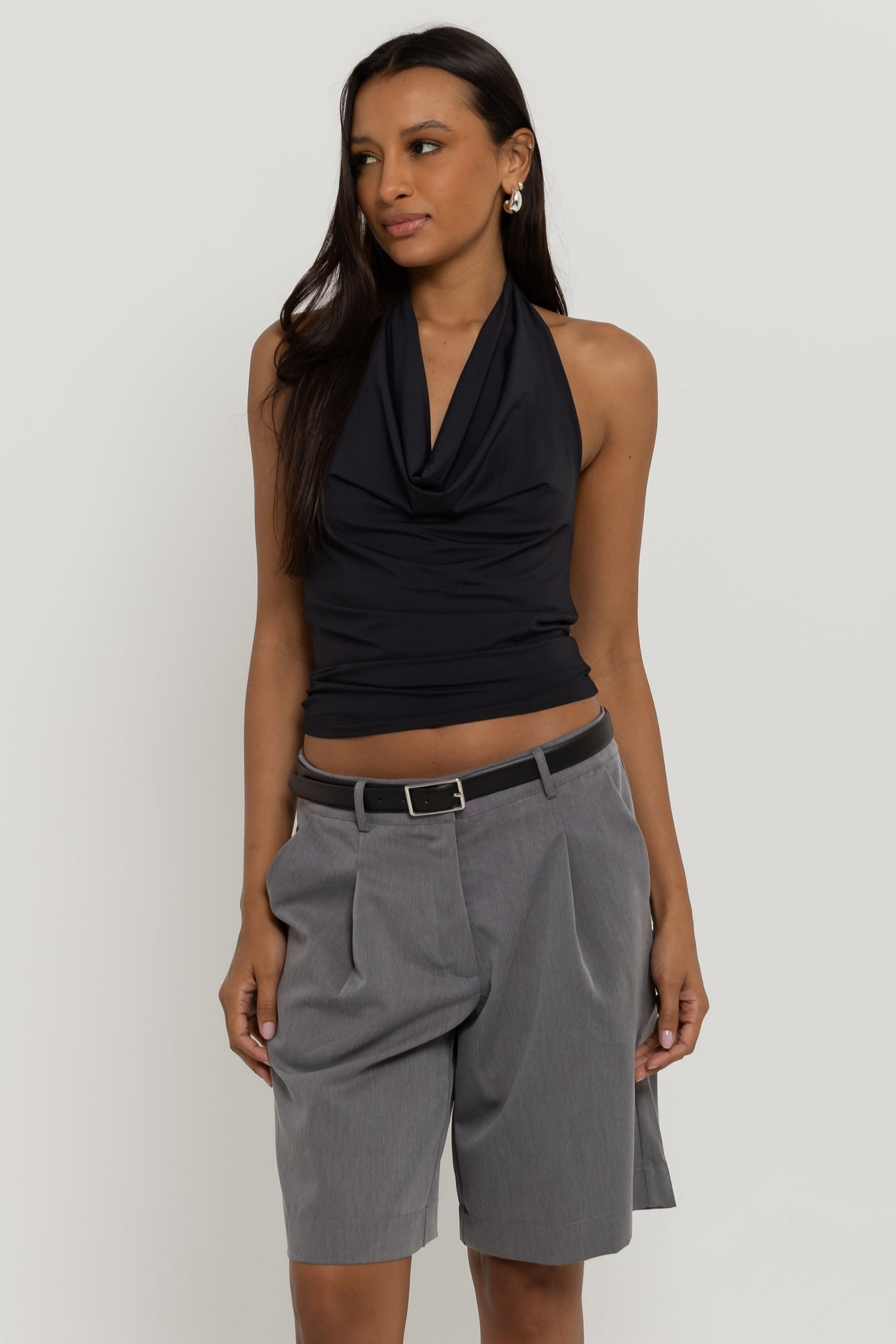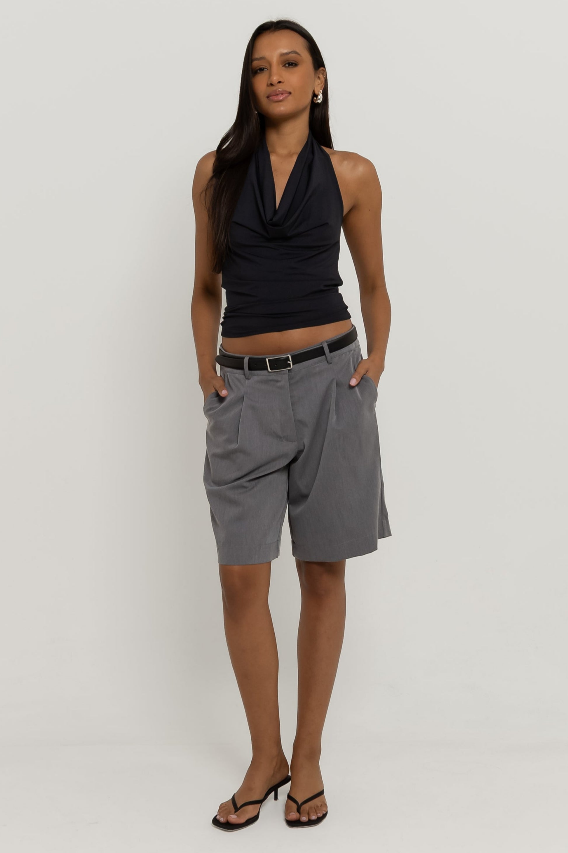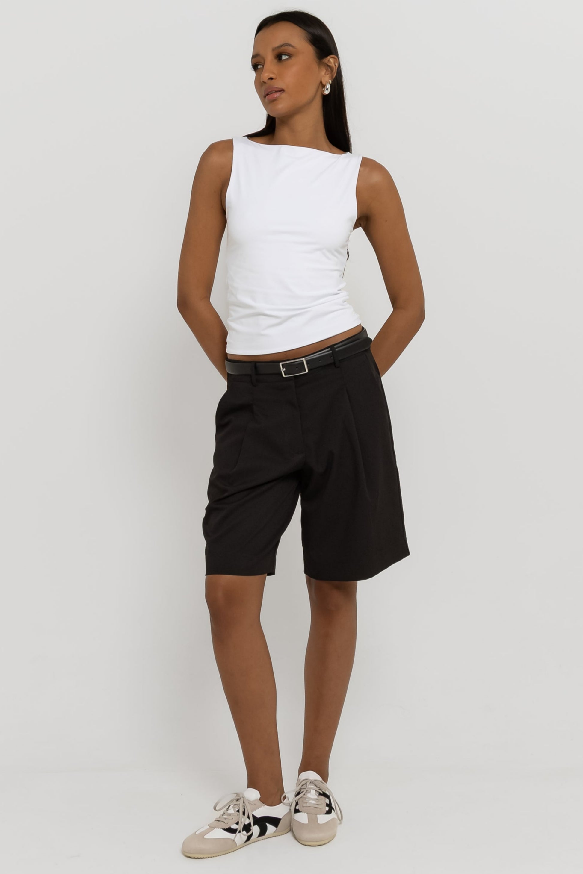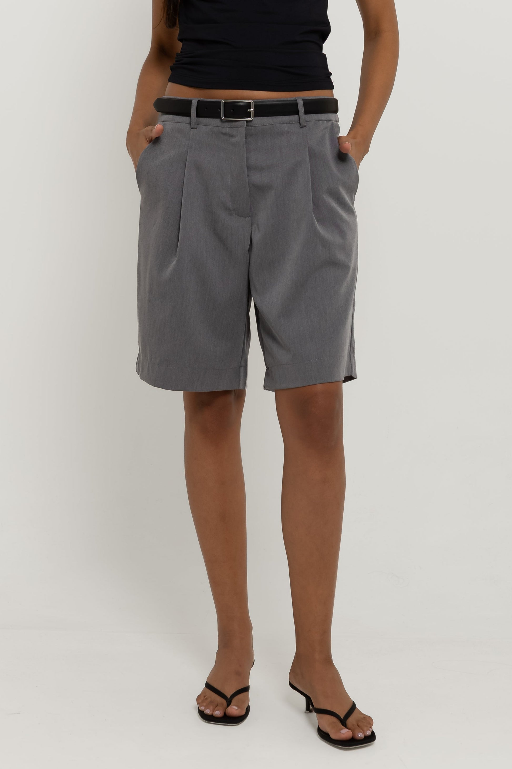 Do office ao happy hour. Confeccionada em tecido de alfaiataria mista com viscose, a Bermuda Bruna possui cintura média, com fechamento em colchete de metal, shape levemente amplo com bolsos faca laterais; um comprimento ideal, que não deixa a peça nem curta e nem comprida no corpo, além do detalhe de pregas e bolso fake único traseiro. Essa peça vai deixar suas composições muito mais interessantes!