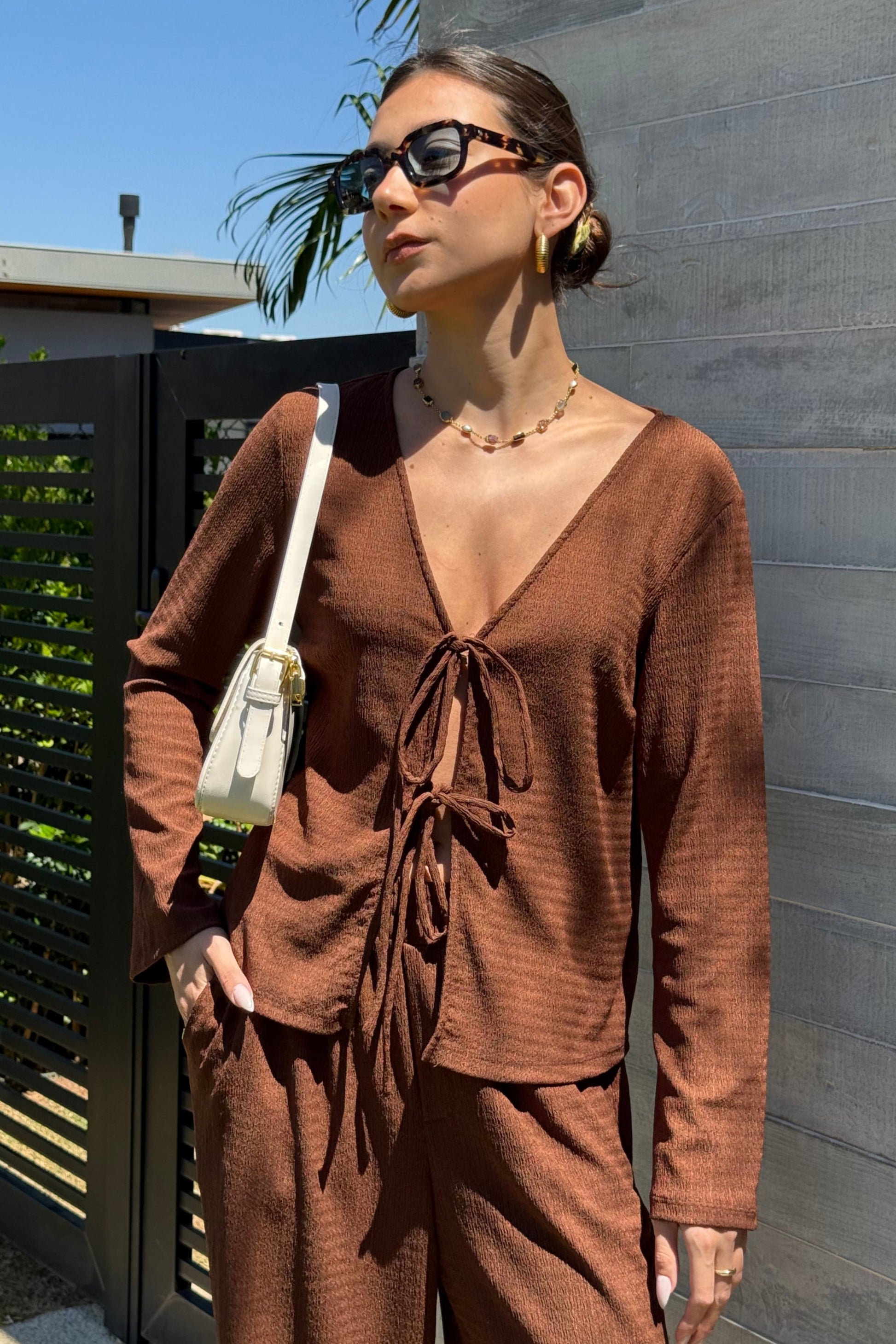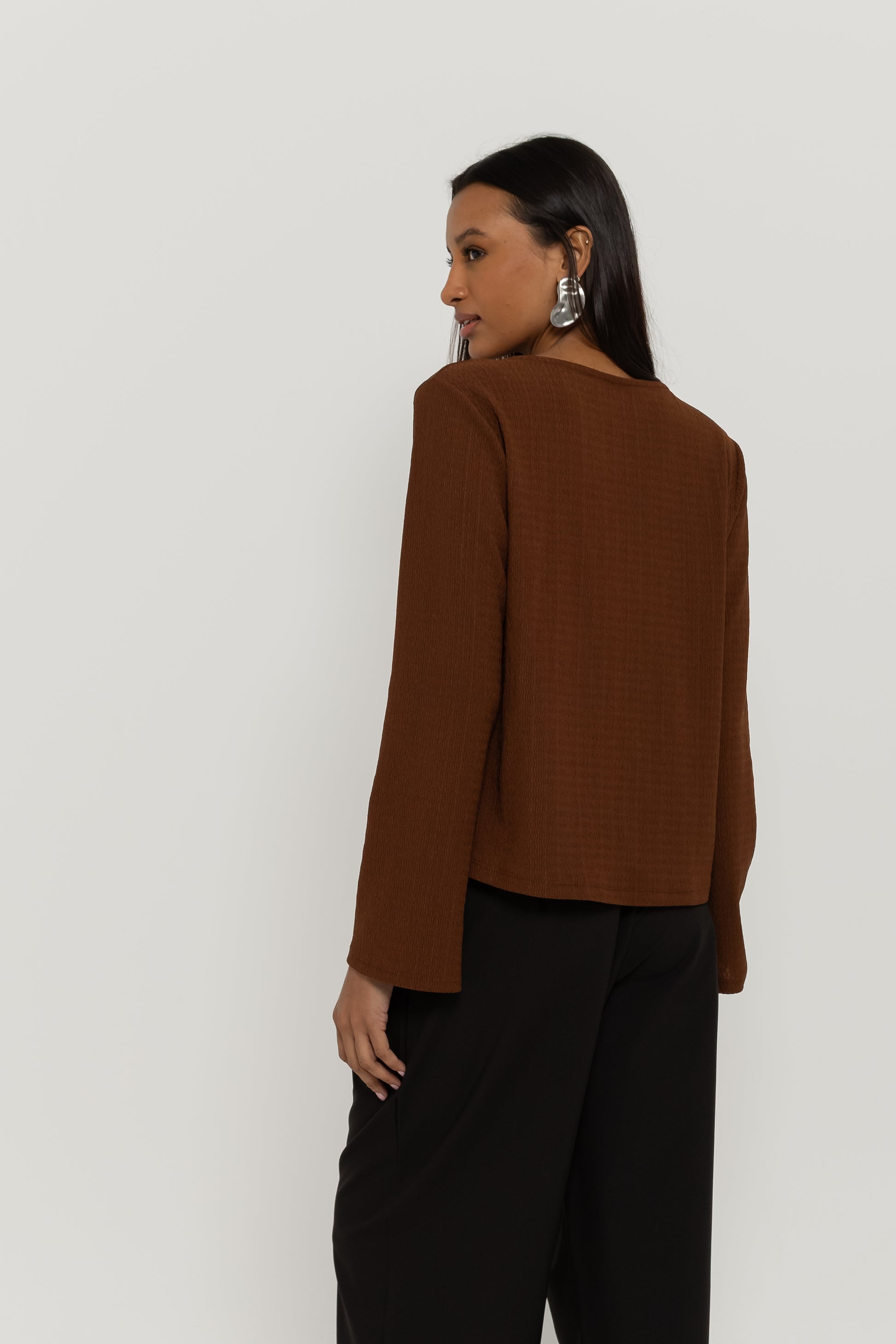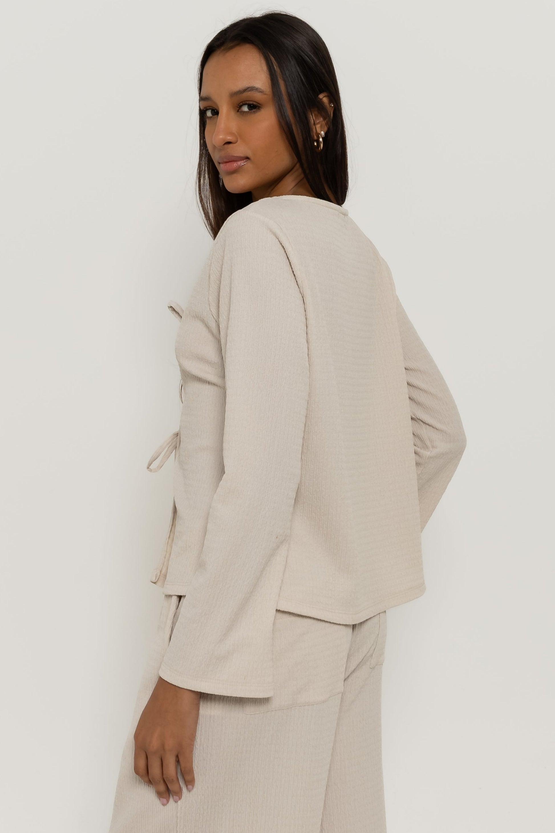 Nunca foi tão fácil estar confortável e estilosa ao mesmo tempo! Confeccionada em tecido de malha texturizada, a Blusa Any possui shape soltinho, com mangas longas levemente flare, e detalhe de lacinhos para amarração para que ajuste como quiser! Ideal para ser usada com a Calça Nicole, formando um lindo conjunto!